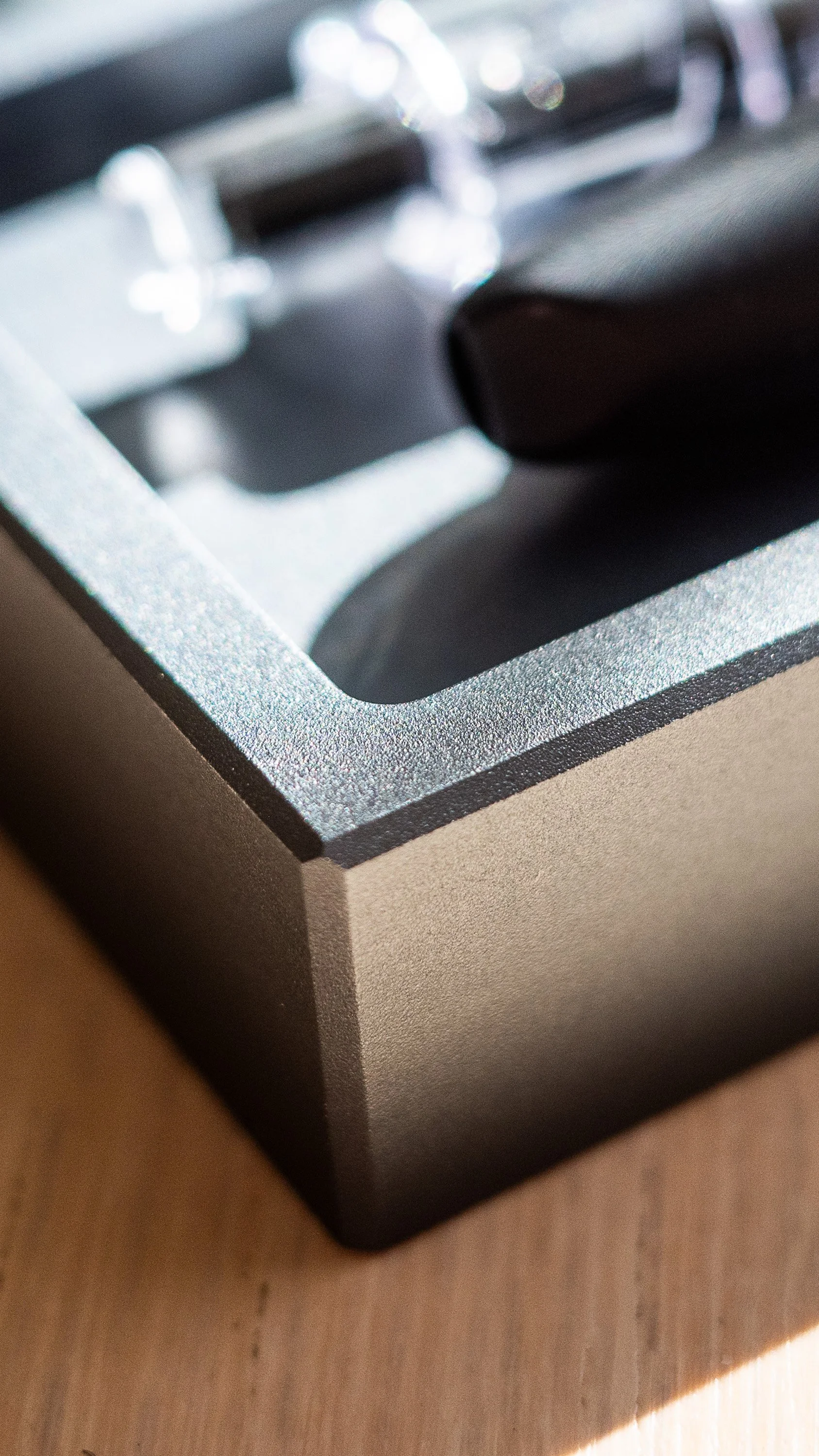 A working surface accumulates. Pens, cables, bearings, watch straps, the small hardware of whatever the day demands. These pieces are designed to sit underneath that accumulation rather than compete with it — dark, low, square — and to assert themselves only when you reach for them. The weight in the hand is the reward for the quiet on the surface.